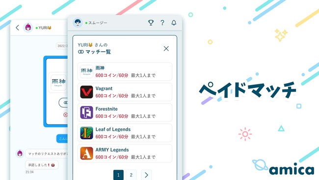 ストリーマーを目指している方などの収益化・ファンづくりの機能として、一緒にゲームをすることで収益化できるペイドマッチが利用できます。ペイドマッチはAmicaに登録した全てのユーザーが利用でき、ゲームをメインに収益化を目指している方の、最初のファンづくりの場として活用できます。