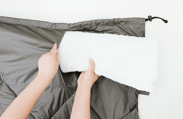 水に強く、少量でもふっくらとしっかりするダクロン(R)︎の層を、カポックにプラスすることで、耐水性とボリューム感が生まれます。また、肌に触れる部分にカポックを使用することで快適な温度を保つのでアウトドアでの睡眠に理想的な構造となっています