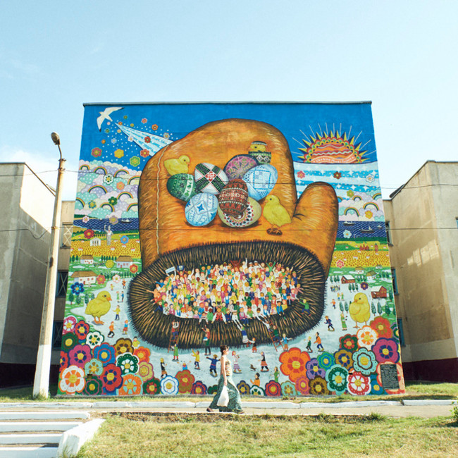 残念ながら現在、壁画は戦火に焼かれ破壊されています。壁画のテーマでもあるウクライナの童話「てぶくろ」は、寒い雪の日に動物たちが手袋を見つけて手袋の中に入っていくお話で、狭い手袋にもかかわらず動物たちは次々に来る動物たちを快く受け入れ、みんなで一つの温かい手袋をシェアするという多様な人々の共生や平和復興の願いが込められています。