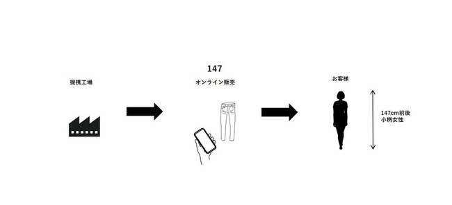 「147」の生産から販売までのプロセス。特定サイズの洋服は生産数が限られるためどうしても価格が高くなってしまうが、147は提携工場から直でオリジナル企画の洋服を生産、実店舗を持たずオンラインで直接販売することで、小柄女性に特化したサイズで、且つ品質にもこだわった洋服をお求めやすい価格で提案しています。