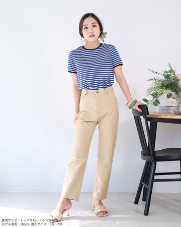 小柄さんがバランスを取りやすい太すぎないボーダー柄にこだわり、全色共通で襟ぐりと袖口にネイビーのパイピングを施した配色カラーがアクセントとなっております。