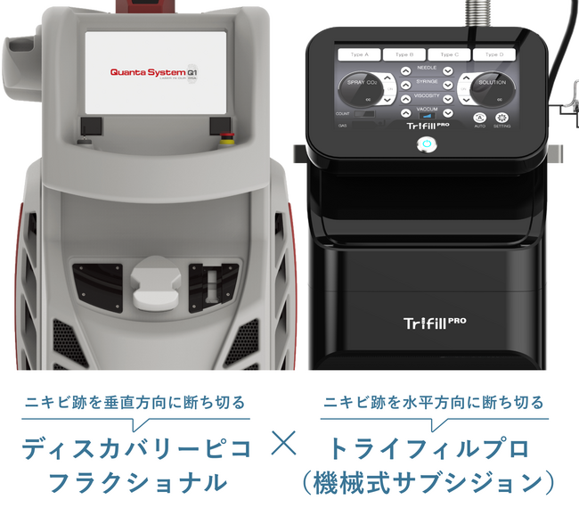 「THE ONE.式ニキビ跡治療」は、癒着した瘢痕組織を垂直方向に切り離す「ディスカバリーピコフラクショナル」と、レーザーでは届かない深い層で癒着した瘢痕組織を切り離す「トライフィルプロ」を組み合わせ、独自のプロトコル(治療方針や方法)で施術を行う、当院オリジナルのニキビ跡治療です。