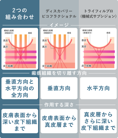 2つの施術の組み合わせにより、深いニキビ跡の原因となる癒着した瘢痕組織を切り離し、凹んだ皮膚をふっくらと盛り上げます。