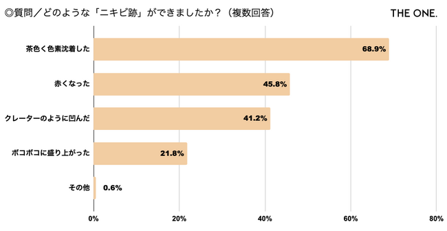 【ランキング】1.色素沈着(68.9%)2.赤くなった(45.8%)3.クレーターのように凹んだ(41.2%)4.ボコボコに盛り上がった(21.8%)