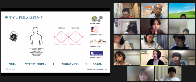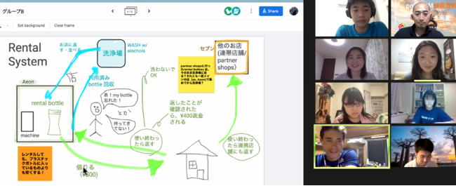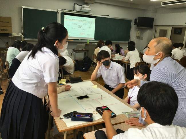 アウトプット:社会課題やビジネス課題に中高生5名程度でチームを組んで、ゼロからのアイデア創出、最後はプレゼンまで臨むことで、個人の課題解決力に加え、社会を変えるリーダーとして活躍するために必要なコラボレーション力・リーダーシップを育みます(希望者は英語ディスカッション・プレゼン)。ロボット開発スタートアップ企業GROOVE X株式会社に対する「家族型ロボット「LOVOT」を国内で10万台販売するためのマーケティングプラン提案」や、オードリー・タン氏にも取り上げられたプラスチックごみ削減に取り組む社会革新活動団体mymizuへの新規事業提案に取り組みました。
