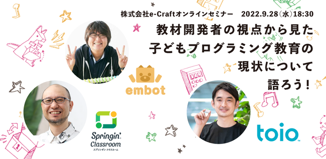 民間企業としてプログラミング教育に携わり、「toio」「Springin’」「embot」という教材を開発する3社のトップランナー達による視点から、現在と未来のプログラミング学習のあり方について、株式会社e-Craftオフィスにてライブ配信で語り合います。