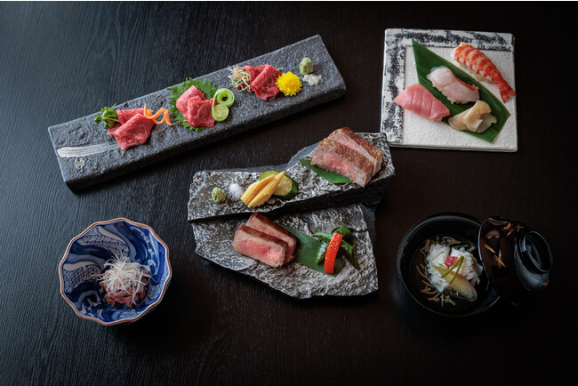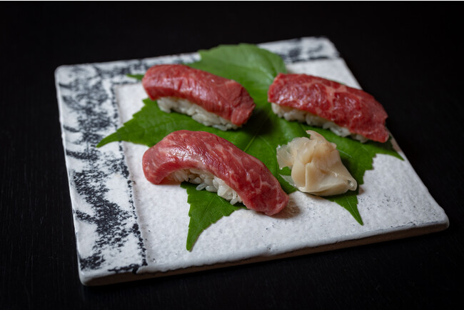 1日5組限定の「肉寿司会席」と自家製「薬酒」を楽しめるプランが新たにスタートしました。「肉寿司会席プラン」では、日本の和牛のルーツとしても知られる「千屋牛(ちやぎゅう)」と赤身の美味しい「なぎビーフ」を贅沢に使用した肉寿司をご用意。この肉寿司の他にも、特選和牛のお造りや、特選和牛のしゃぶしゃぶ、特選和牛のステーキなど、計10品からなるご夕食コースです。