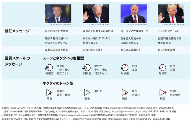 一方、プーチン氏とトランプ氏2人のネクタイ色は赤色でスーツの青色と対決型であり、スーツの暗色トーンとネクタイの色との対比が相手を厳しく威圧する感情を表しています。