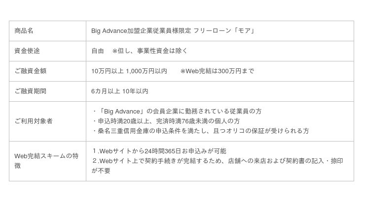 株式会社オリエントコーポレーション(東京都千代田区、代表取締役社長:飯盛 徹夫、以下「オリコ」)は、桑名三重信用金庫(三重県桑名市、理事長:中澤 康哉)と提携し、中小企業の経営課題を解決するための経営支援プラットフォーム「Big Advance」の会員企業向け職域フリーローンの提供を開始いたしました。