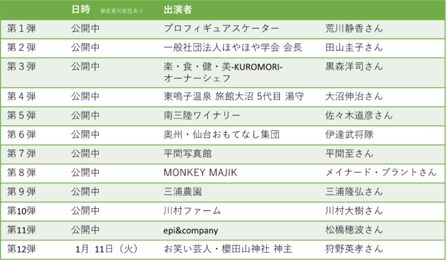公開中の第11弾の出演者は、epi&company代表の松橋穂波さん。本日公開した、最終回となる第12弾はお笑い芸人で実家の櫻田山神社第39代神主も務める栗原市出身の狩野英孝さんです。