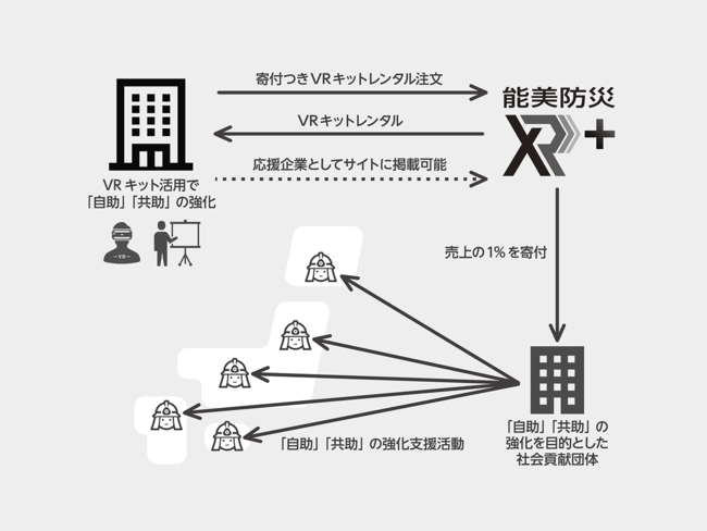 「XRプラス」では、その売り上げの1%を「自助」「共助」の強化に取り組む社会貢献団体へ寄付することで、継続的に支援する仕組みにしています。