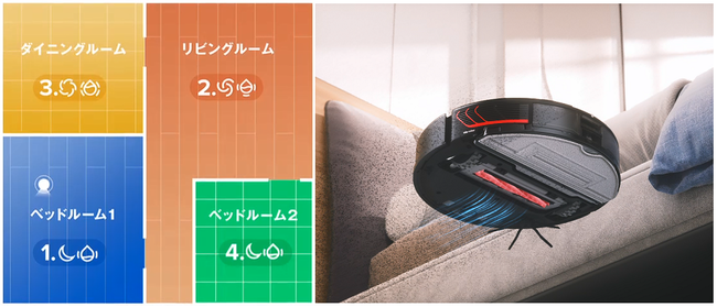 また、部屋ごとに掃除モードや掃除する部屋の順番をお好みで設定できることに加え、新機能として、ダイニングでは吸引や水拭きを強力なモードで提案するなど、ロボット掃除機が床や家具から部屋を予測して最適な吸引力や水拭き強度や掃除順を提案します。さらに、障害物の認識機能を生かして、マップ上に認識された家具の周辺だけをピンポイントで掃除する機能も新たに搭載しました。