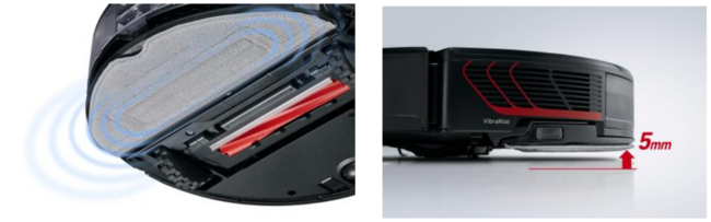 また、水拭きではこれまでの最上位機種であったS7シリーズの水拭き性能を全て搭載しました。最大毎分3000回動く高速振動モップと600gの高加重モップにより、皮脂、コーヒー、花粉など、こびり付いた汚れも綺麗に拭き上げます。さらに、水拭き掃除中に超音波センサーがカーペット※8 を検知すると、 水拭きモップが自動で 5 mm持ち上がり、吸引掃除のみを行えるなど、利便性も高い掃除を行います。