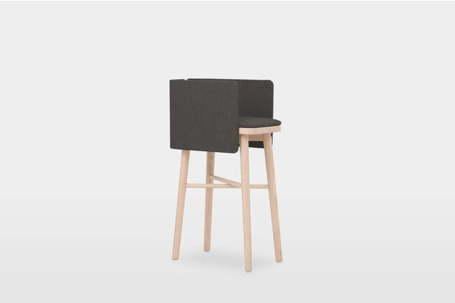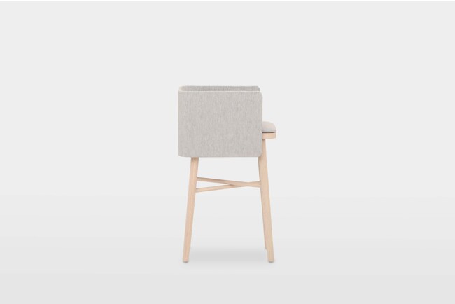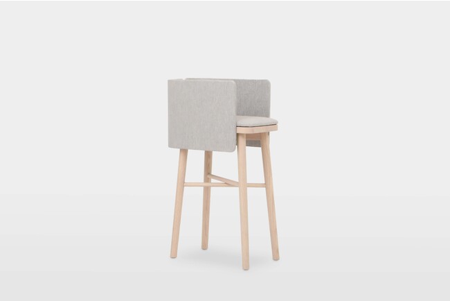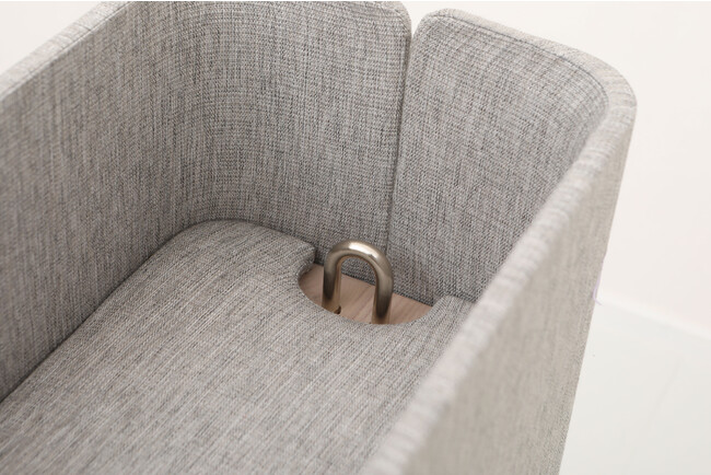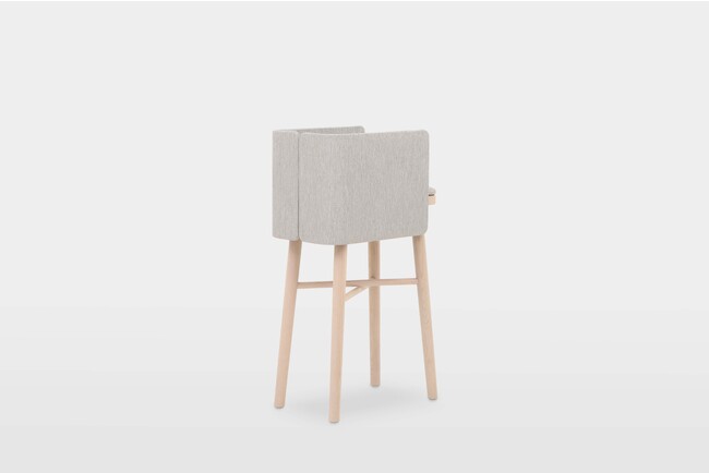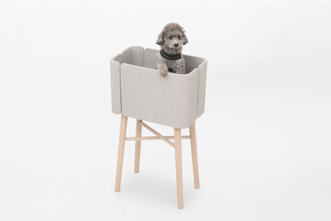 フレームにはホワイトアッシュ材を使用。着脱可能な座面とパネルは張り地で仕上げました。ファブリックは4色(ライトグレー・ブルーグリーン・イエロー・チャコールグレー)から選択可能です。今後レザー調仕上げもラインナップ予定です。サイズはSとMの2種展開。設置スペースやペットの大きさに合わせて選択可能です。