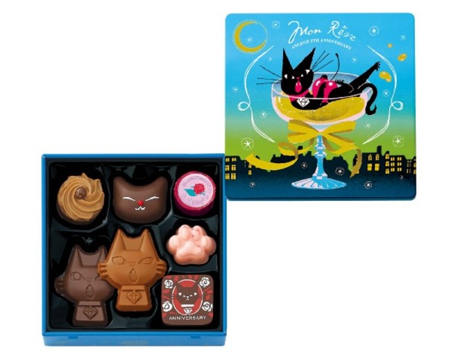 アンジュジュの今年のデザインテーマはブランドが誕生して5周年を記念した「パーティー」。愛くるしい黒猫の「アンジュジュ」が描かれたパッケージには、猫型の立体チョコレートや、肉球型チョコレートなど、箱から中身まで猫好きの方にはたまらないラインナップです。また、職人たちの手作りならではの可愛らしさが人気の「アニマルショコラ」は 今年公式オンラインストアで「アニマルショコラ W」として初登場いたします。