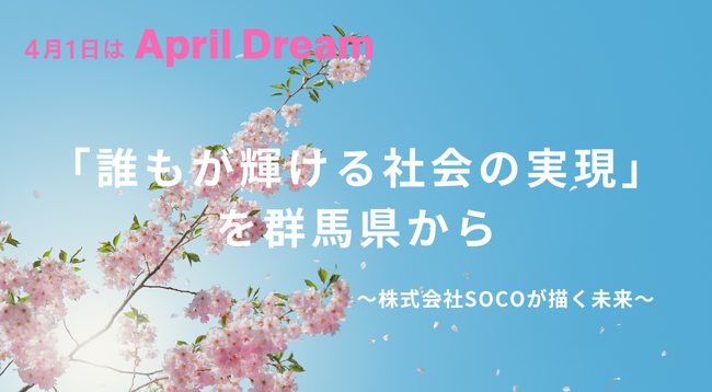 このプレスリリースは、April Dreamプロジェクトに共感し、4月1日を夢があふれる日にしようとする事業者が、やがて叶えるために発信した夢です。当社は、「April Dream 4 月 1 日は、夢の日。」に参加しています。このプレスリリースは株式会社SOCO(本社:群馬県、代表取締役:上野操子、以下「SOCO」)の April Dream です。