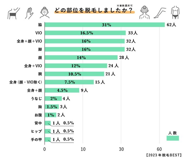 「脇」を脱毛した方が最も多く、「医療脱毛でも脇は料金が安く、気軽に始められる」「必ず処理する必要がある部位だから、脱毛してしまった方が手っ取り早い」という声が多く寄せられました。