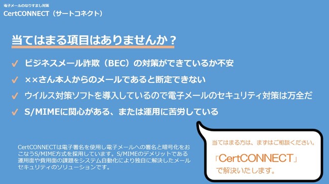 CertCONNECTはS/MIME(エスマイム)の電子証明書を用いた電子メールへの署名と暗号化により、御社のメールに安全のしるしを付与します。