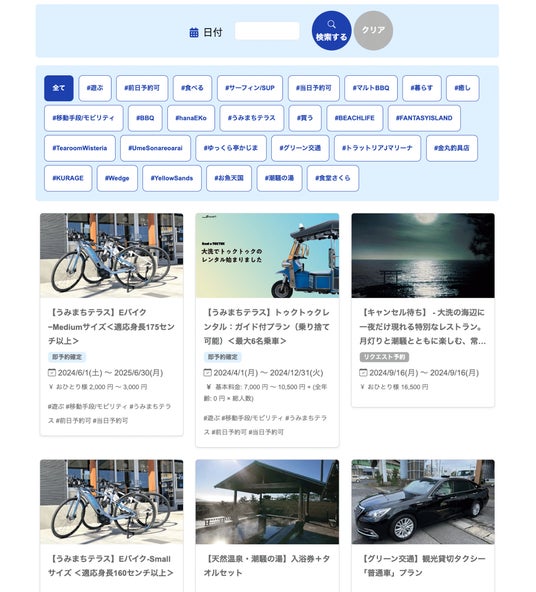 オンライン上で、茨城県大洗町ならではのレジャー・遊び・体験スポット・飲食店の予約ができます。また、日付検索もできるため、宿泊客の前日予約・日帰り客の当日予約にも対応可能です。