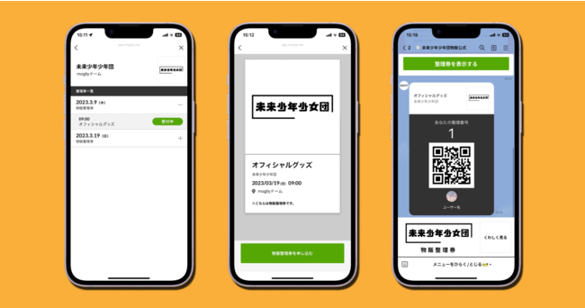 『mogily』はLINEの「LINE Messaging API」経由で提供されるデジタル整理券システムです。「LINE公式アカウントでデジタル整理券を発行する」というシンプルな機能で、コンサートやリリースイベント、ライブにおける無料整理券(抽選・先着どちらも可能)や人気店舗における入店抽選券などを、全てすべてオンラインで配布~入場処理まで行うことができます。お客様は会員登録不要かつ1タップで整理券を取得でき、「LINE」アプリがあればどなたでも無料で整理券を取得することが可能です。・グッズエリアの密を回避