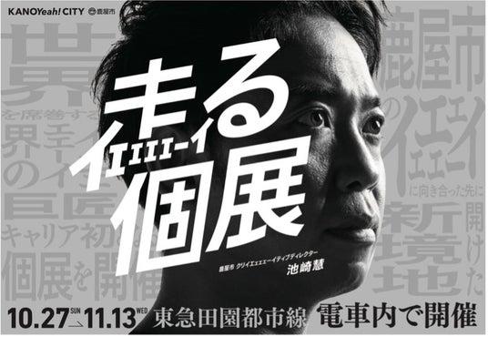 3期目となる今年は、2024年10月27日(日)から11月13日(水)まで、東急田園都市線電車内にて「走る個展」を実施いたします。「クリイエェェェーイティブディレクター池崎慧」のユニークなキャラクターと鹿屋市の魅力を掛け合わせた個展が、電車内広告をジャックした特別な空間で展開されます。