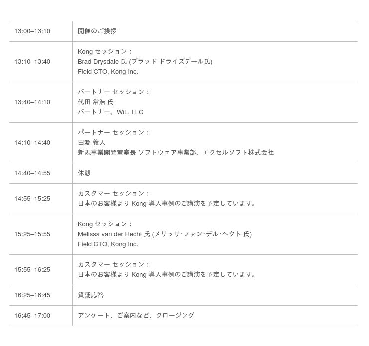 Zoom を使った 100% オンラインの本イベントでは、本年 9 月にオンラインで開催された、グローバル カンファレンス Kong Summit 2021 のエッセンスを日本語でお伝えします。エクセルソフト株式会社のセッションでは Kong Summit 2021 から、以下の内容のセッションをピックアップしてお届けします。