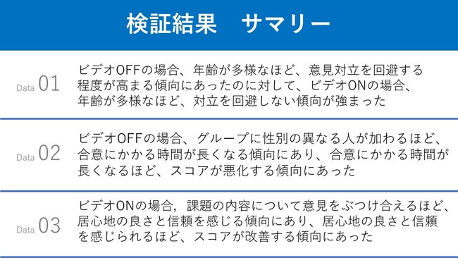 「ビデオON」「ビデオOFF」の2パターンで、対話における意見対立や、合意形成にかかる時間、
