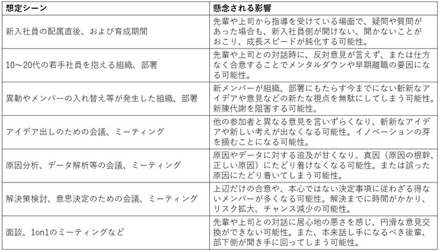 以下の想定シーンにおいてビデオOFFでコミュニケーションをとった際に懸念される影響を考察しました。
