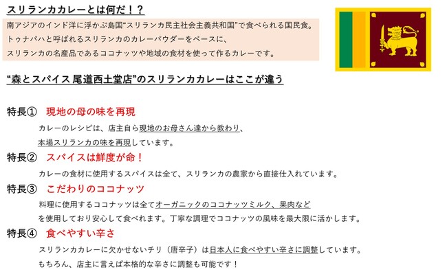 森とカンパニー株式会社(本社・愛媛県北宇和郡松野町目黒386−1 取締役社長:吉井知世)は、スリランカのスパイス農家から直接仕入れたスパイスと地域の食材を使用した、尾道初スリランカカレー専門店【森とスパイス 尾道西土堂店】を2023年2月3日(金)に開店します。