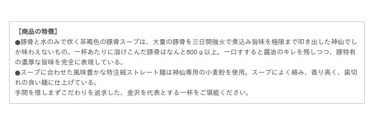 この度はせたが屋前島社長を通じてご縁をいただき、ご当地ラーメンチャレンジに参加させていただくことを心から感謝致します。日本の中心地である東京駅に名だたる名店が集う東京ラーメンストリートにて、加賀百万石の地、金沢本店の味を初提供できる喜びをかみしめながらスタッフ一同、誠実に手間と労力を惜しまず作らせて頂きます。僕は不器用なので万人全てに愛されるラーメンは作れないですが、食べたお客様の誰かにとって神仙のラーメンが心に残れるよう純粋に実直にラーメンを作らせていただきます。他では味わえない唯一無二のラーメンをこの機会に是非お楽しみください。