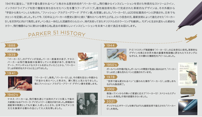 創業者ジョージ・サッフォード・パーカーによる「優れたペンを作り上げる」という信念のもと、革新的な独自のインクシステムを世界へと広めたパーカー。1941年に誕生した「パーカー51」はその斬新なフォルムと機能性が評価され、世界的なヒットとなったことから“世界で最も愛されるペン”と称されました。新発売の「パーカー51 モダンヘリテージ」はオリ ジナルの魅力を受け継ぎながら、最新技術でモダンに進化させ、その素晴らしさを未来へと紡いでいきます。