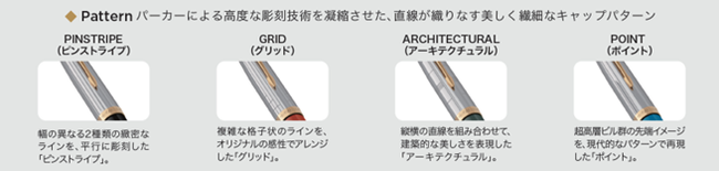 1888年創業。高級筆記具の世界において、130年以上にわたり、革新性、スタイル、独自性の高いクラフトマンシップを追究し続け、お客様に書くことの悦びを提供してきました。パーカーの象徴である「矢羽クリップ」には、「未知の世界に挑戦し、新たな可能性を探し求める志の高い人々の道標でありたい」というメッセージが込められています。
