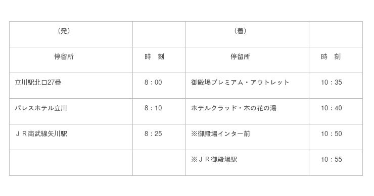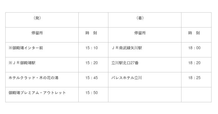 立川バス株式会社(本社:東京都立川市、代表者:取締役社長 山田 恭章)では、現在「立川・矢川駅発御殿場プレミアム・アウトレット、ホテルクラッド・木の花の湯」行き直行の高速路線バスを1日1往復運行(平日を除く)しておりますが、2023年7月8日(土)より、静岡県東部の中規模都市である御殿場市の代表駅JR御殿場駅に乗り入れを開始します。