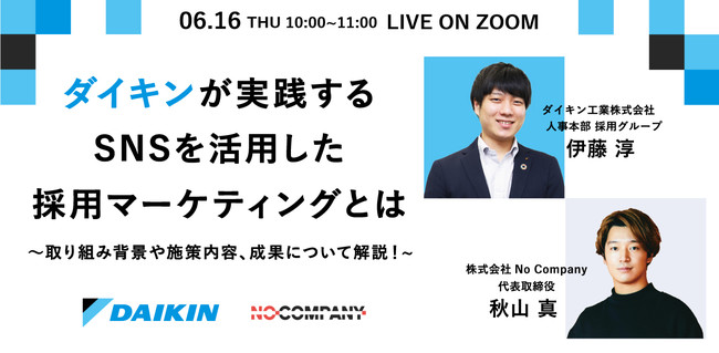株式会社No Company(本社:東京都港区、代表取締役社長 秋山真)は、2022年6月16日(木)に、企業の採用担当の方向けに、採用マーケティングに注力しているダイキン工業株式会社の事例を紹介する無料ウェビナー「ダイキンが実践する SNSを活用した採用マーケティングとは」を開催いたします。