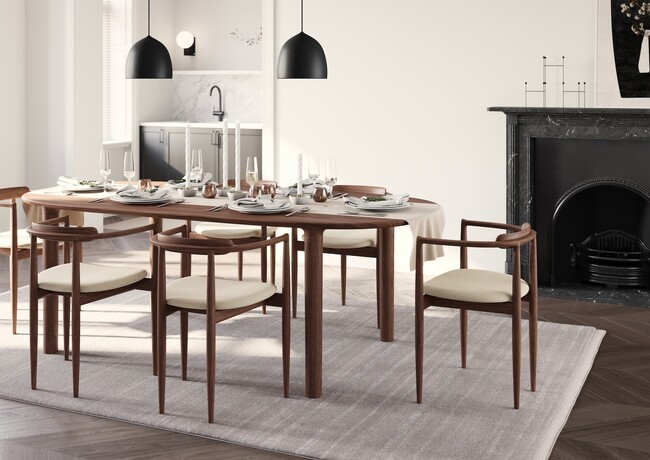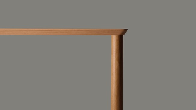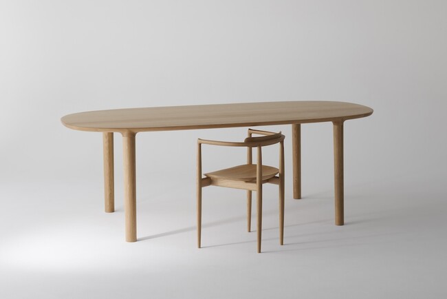 伸縮の影響を受けやすい無垢天板ですが、4本の脚を幕板や樌(ぬき)で繋がない独立した構造にすることで、意匠性を保ちながらもその課題に応えました。ブルレック兄弟がデザインした無垢材のチェア、MusubiアームチェアやShakuチェアにも通ずる、彫刻的パーツを美しく接合するというアイデアが生かされています。有機的な表情を持ちながらも均整のとれたプロポーションのテーブルは円形と長方形があり、あらゆるシーンに対応可能です。一目で印象付ける力強い存在感があるため、KOYORIの個性豊かなチェアラインナップを受け止めてくれるテーブルです。