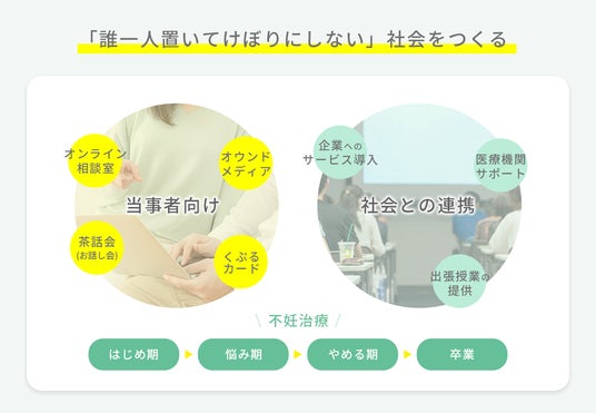 妊活・ライフキャリアのオンライン相談室『ハナセルフ』の運営、同じ悩みを持つ当事者同士がわかち合う「茶話会」の開催、妊活・不妊治療のお役立ち情報の提供、医療施設の選択に悩む方のための「不妊治療の医療機関の取材記事・医療従事者からのエールメッセージ・海外の不妊治療経験者のコラム配信など