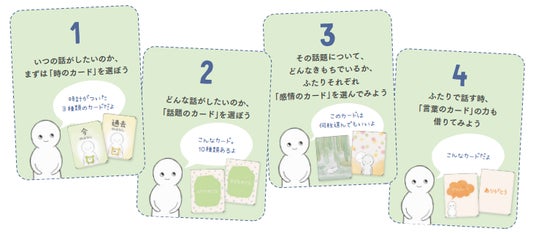 くぷるカードは、自分とパートナーとの対話のきっかけをつくるカードです。「時のカード」「話題のカード」「感情のカード」「言葉のカード」の4種類で構成されています。感情のカードにはオリジナルキャラクター「ユマン」の様々なシチュエーションのイラストが描かれており、言葉にならない感情を感覚的に表現する手助けをします。