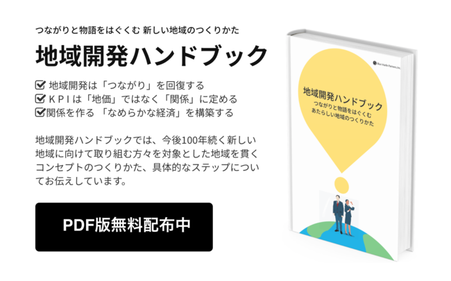 『地域開発ハンドブック』は、都会でキャリアを積んだビジネスパーソンが、地方でビジネスマインドを発揮するための本です。本書は、これまで日本全国の方々と対話を重ねて蓄えてきた知見を世に共有し、少しでも地域の発展に貢献するという目的を持って制作されました。私たちは、2040年以降の社会のことを見据えて、地域に”あたらしい経済”と”つながり”を創ることが必要であると考えています。このハンドブックを通して、未来の地域のさらなる発展に寄与できれば幸いです。