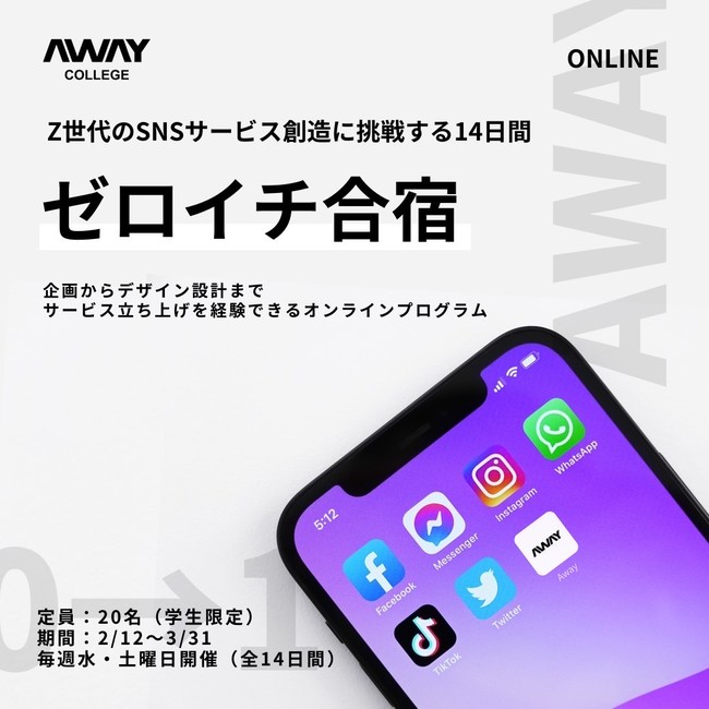 Z世代向け教育事業を展開する株式会社 AWAYは、2月から3月にかけてZ世代/学生向け実践型オンラインプログラム「ゼロイチ合宿」Z世代のSNSサービス創造-ONLINE-を開催致します。