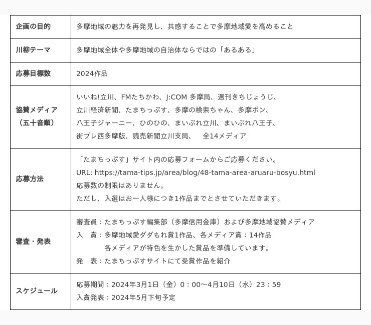 多摩信用金庫(本店:東京都立川市 理事長:金井雅彦)が運営する多摩地域の情報を発信するオウンドメディア「たまちっぷす」にて、3月1日から「多摩地域あるある川柳 2024」を開催します。