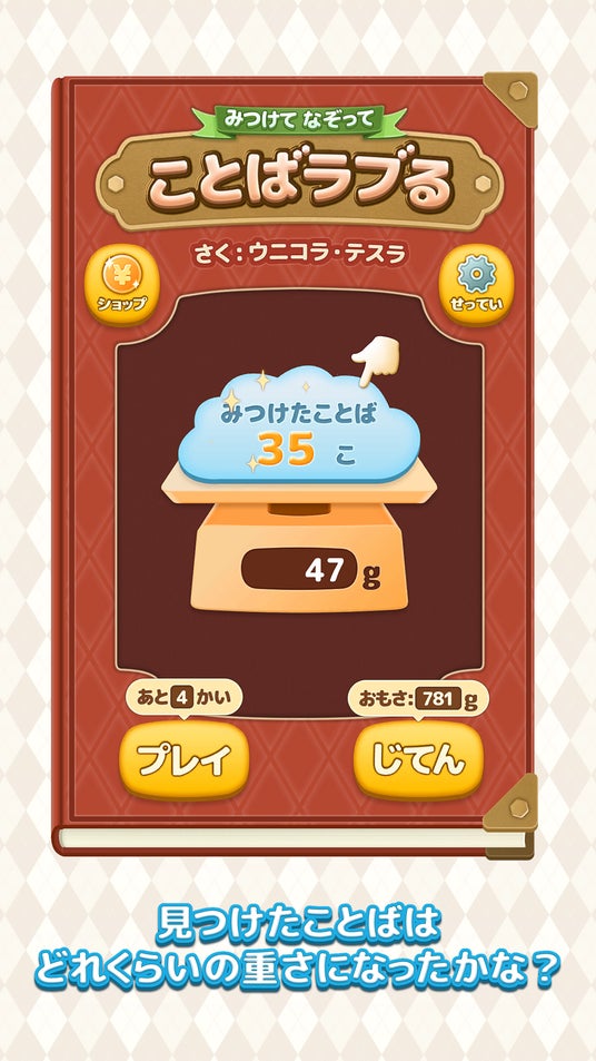 一回のプレイでどれだけことばを見つけ出し、辞典の重さを増やせるかに挑戦してみましょう!