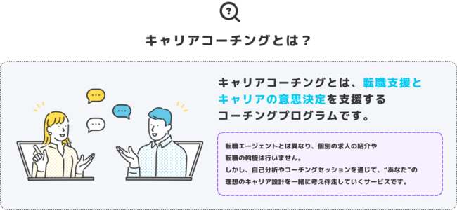 キャリアコーチングとは、キャリアや転職に悩んでいるビジネスパーソンに対して、理想のキャリアを実現するために人生・キャリアに関する「思考の整理(自己分析)」から「入社後のアクションの実行」までサポートするサービスです。