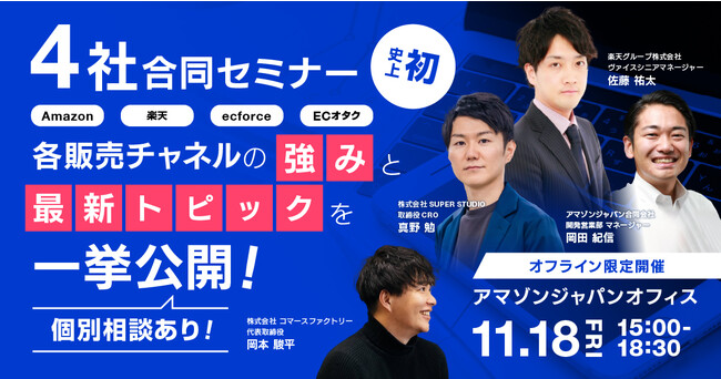 Amazon・楽天市場・自社EC、それぞれの強みを自社目線で語って頂くだけでなく、互いに質問しあうことでそれぞれのサービスを深堀する、今までにない試みになります。最後には任意参加で個別相談会も実施します。