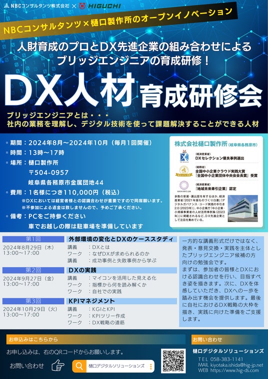 樋口デジタルソリューションズ株式会社(岐阜県各務原市、代表取締役社長:樋口徳室URL https://www.hig-ds.com/)は、2024年8月・9月10月にDX人材育成研修会を開催します。