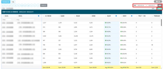 なお、本機能リリースにあわせて先行して可視化されていた「PICKING GOの利用状況」についても機能を強化し、期間指定及び日次データの集計・閲覧と出力ができるようになります。