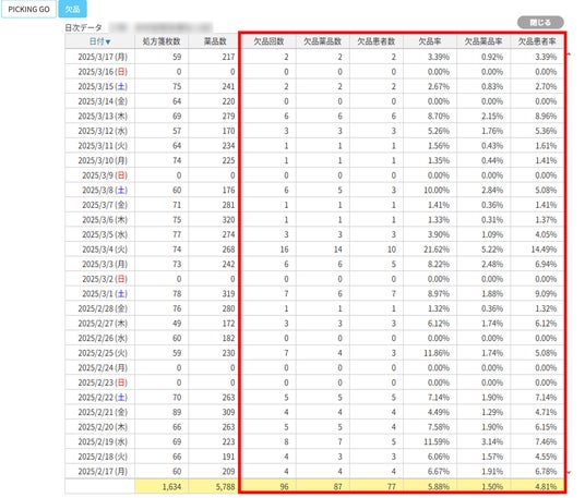 本機能では、PICKING GOで登録された欠品について、運営指標となる各種の情報を抽出・可視化しブラウザ上で確認できるようになります。これにより、店舗で日々「どの程度の欠品が発生しているのか」や「何名の患者に対して欠品を生じさせてしまったのか」を店舗及び本部で簡単に把握・共有することができるようになり、今後の業務改善をよりスピーディーに行うことが可能になります。