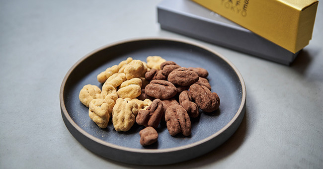 カカオのほろ苦さと⽢さがペカンナッツの香ばしさと重なり、バランスよく口の中に広がります。ココアパウダーでコーティングすることで⾆触りのよい一品となっています。