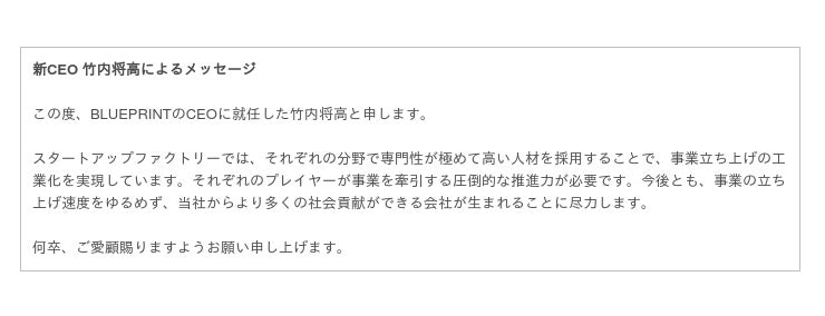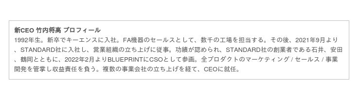 Vertical SaaSに特化したスタートアップファクトリーを運営する合同会社BLUEPRINT(本社:港区、以下:BLUEPRINT)は、CSO(Chief Sales Officer : 最高営業責任者)を務めていた竹内将高が2022年7月1日付でCEO(Chief Executive Officer : 最高経営責任者)に就任いたしましたことをお知らせいたします。また、前CEOの石井大智はFounderとして、引き続き当社の経営に携わってまいります。
