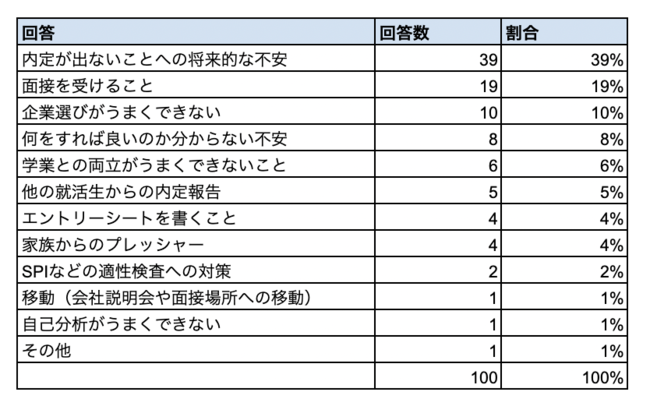 1位は「内定が出ないことへの将来的な不安」で39%、2位は「面接を受けること」で19%、3位は「企業選びがうまくできない」で10%という結果になりました。