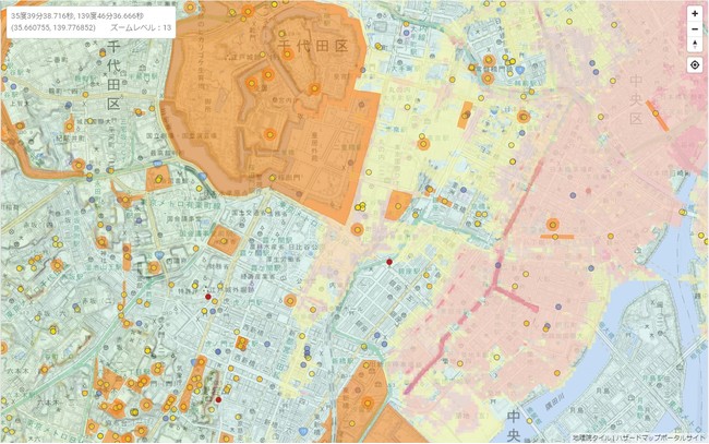 ハザードマップと約61万件の文化財情報を重ねて表示させることで、災害発生前後の分析や評価に活用することができます。一元的な情報統合は、文化財レスキューの際、迅速な評価と必要な即応につながります。また、普段から地域レベルでリスクを把握しておくことで、地域づくり等にも貢献します。